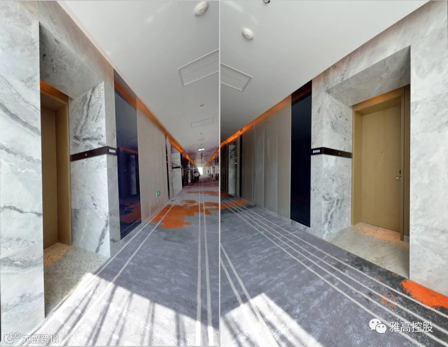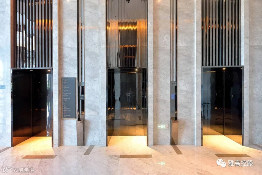 电梯口处简约的走廊,在黑白灰的交叉碰撞,雅高大理石的应用,让空间富有泼墨即画的江南意境,却难掩跃然的活泼与节奏感。