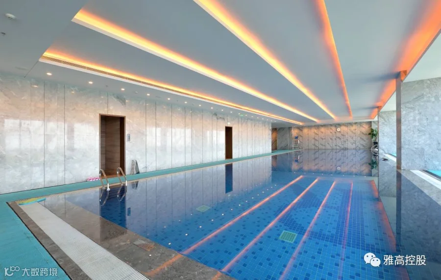 游泳区设有清新开阔的游泳池,设计师融入雅高大理石,并通过光影的作用,在水面切出分割线,形成倒影,有种山山水水尽收视野的美妙之感。