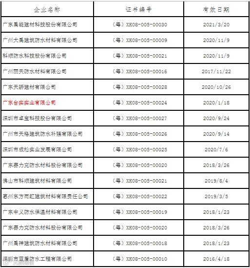 广东省建筑防水材料协会会员单位获建筑防水卷材生产许可证名单如下:
