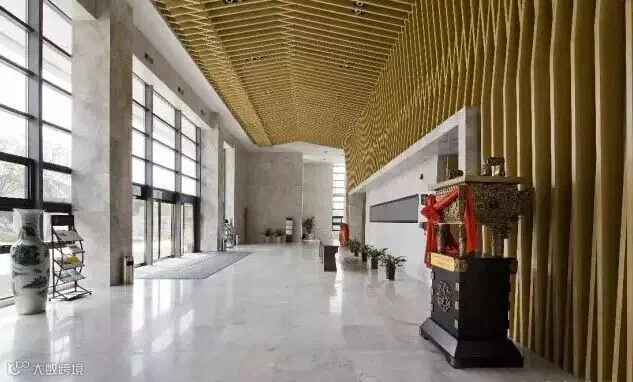 教学楼大厅采用现代化设计,优雅而简约的雅柏灰墙壁犹如沉稳且蕴含人生“大道”的文史哲学,木质格栅的线条造型神秘而别致,镂空设计更添优雅。