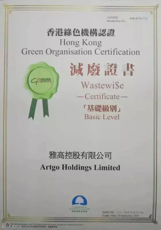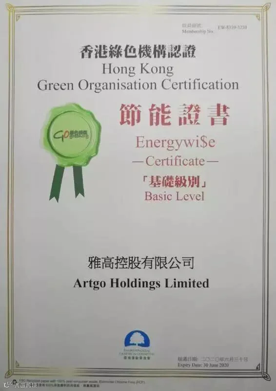 雅高控股2018年度荣获香港绿色机构ESG认证「减废」·「节能」荣誉证书