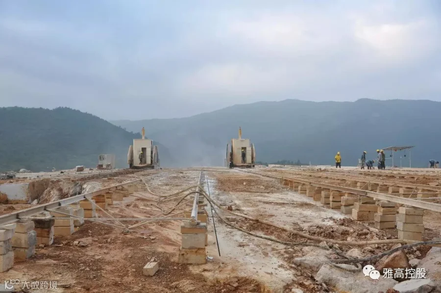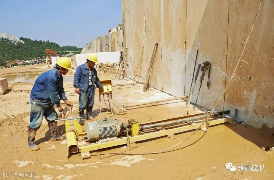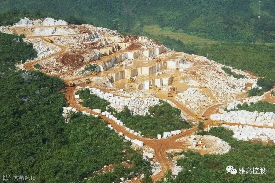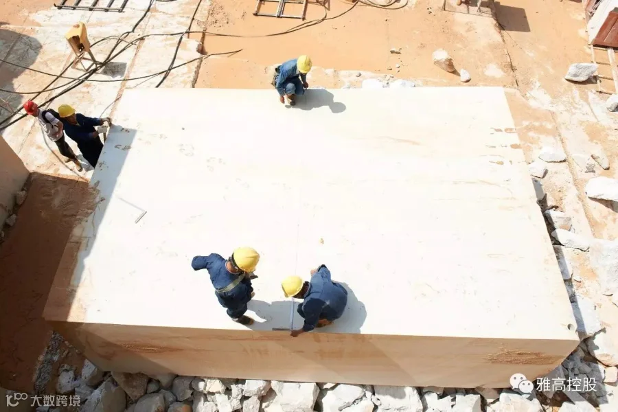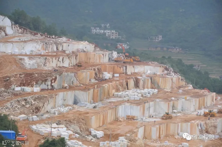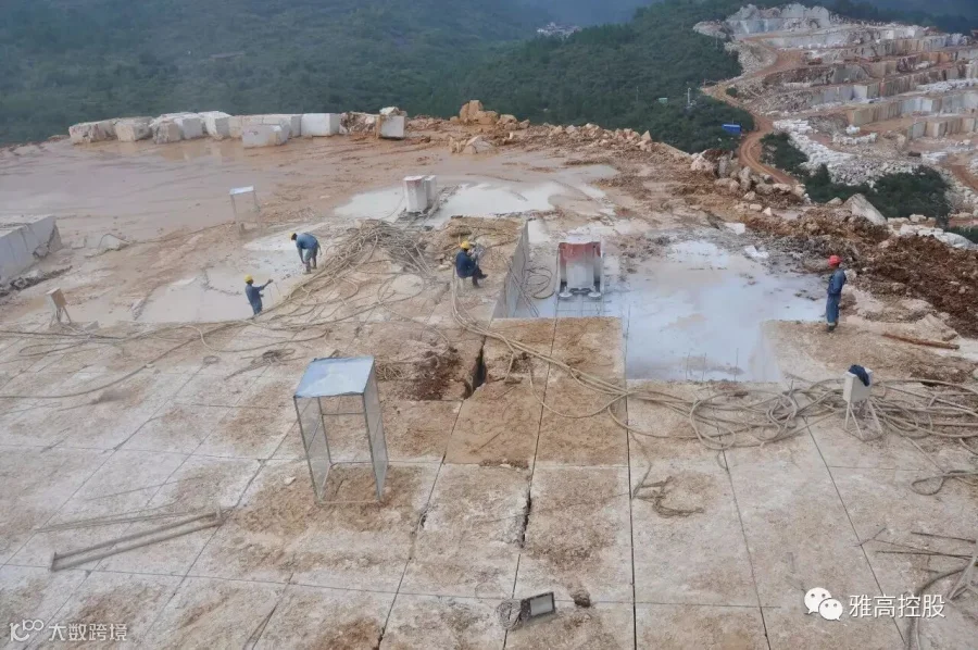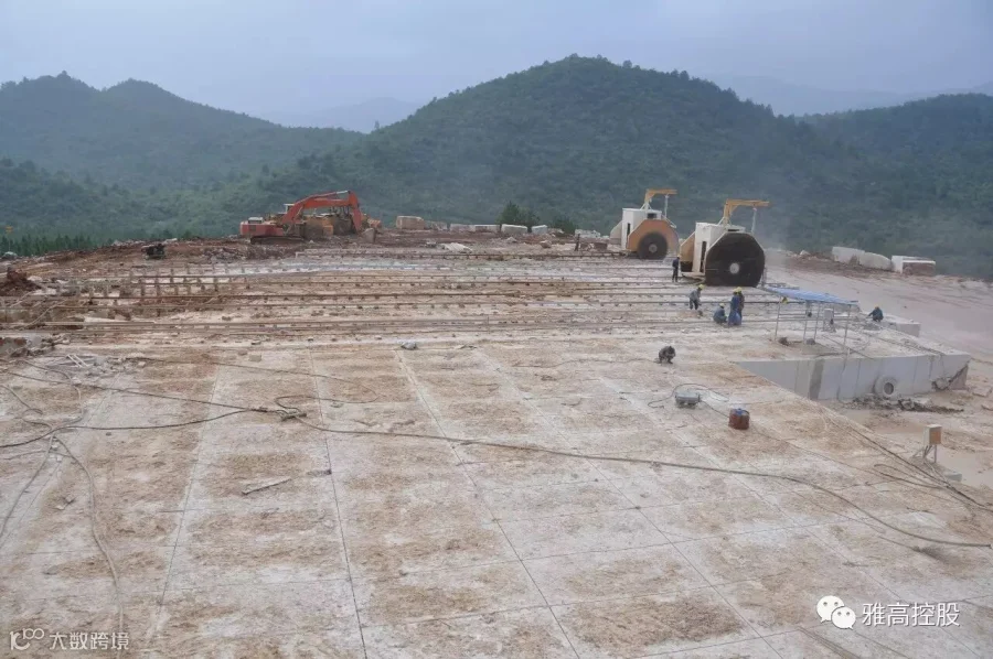 矿山开采是石材工业生产的首个环节,也是影响和制约石材业发展的重要环节。雅高永丰矿山开采全部采用金刚石绳锯工艺,有条不紊的开采程序、顺畅的荒料输送通道、宽阔规范的开采平台,以及与采矿区隔路相望、大规格荒料堆积如山的荒料堆场……整个矿区场面恢弘,令人震憾。这是一座经高水平勘探、规划、设计团队科学设计的矿山,是一座管理规范、采用先进工艺技术及装备进行生产的现代化大理石矿山。
