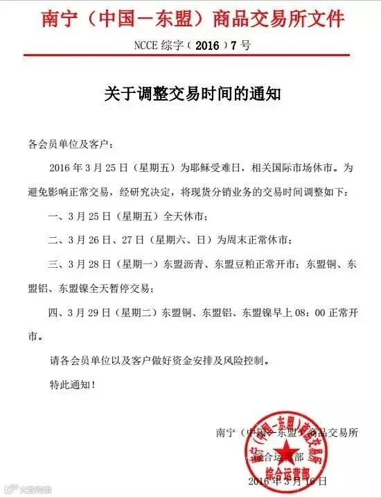 导读:以下是南宁(中国——东盟)商品交易所关于调整交易时间的通知,请各位客户知悉并提前做好资金安排