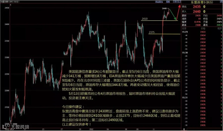 东盟沥青盘中震荡交投于2430附近,盘面延续上涨趋势不变,建议以逢低做多为主,等待价格回调到2410区域做多,止损2375,目标价2466区域,到位止盈或提高止损价保本持有,第二目标价2490区域。