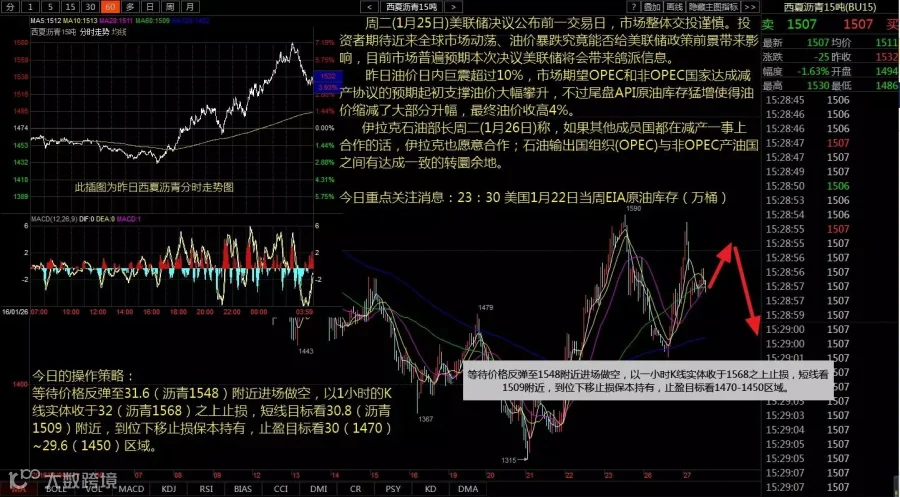 等待价格反弹至31.6(沥青1548)附近进场做空,以1小时的K线实体收于32(沥青1568)之上止损,短线目标看30.8(沥青1509)附近,到位下移止损保本持有,止盈目标看30(1470)~29.6(1450)区域。