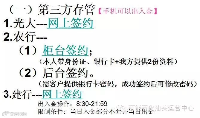 网上客户请参考下图中第二点提供资料给客服噢!其他方式的银行时间请参考后进行银行卡的签约选择!