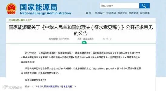国家能源局发布首部《中华人民共和国能源法(征求意见稿)》