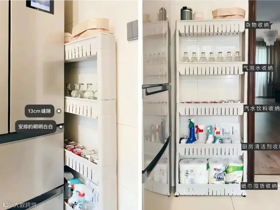 不想定制也没关系啊,网上现成的缝隙柜也才几十块,虽然比定制的稍微差一点,但装的东西也够多了,随便塞囤货都没问题。
