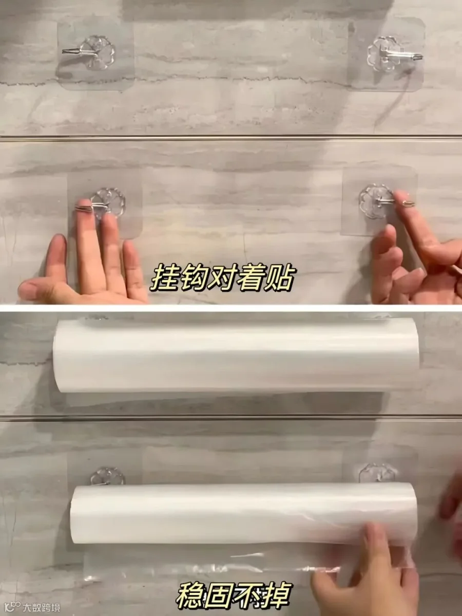 厨房的保鲜膜保鲜袋,是不是总扔在抽屉里,找半天找不到?对着贴两个挂钩,直接把保鲜袋盒子挂上去,用的时候撕一张,顺手得不行,还不占抽屉空间。