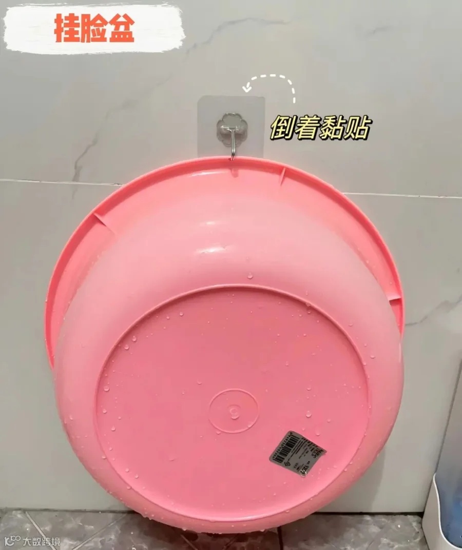 你家脸盆是不是都堆在浴室角落,堆得乱七八糟还沥不干净水,臭烘烘的?你把挂钩倒着贴在墙上,脸盆直接往上一挂,全都上墙,沥水还整齐,地面再也不会湿乎乎的了,稳固得很,我家最重的洗脸盆挂了两年都没掉过。