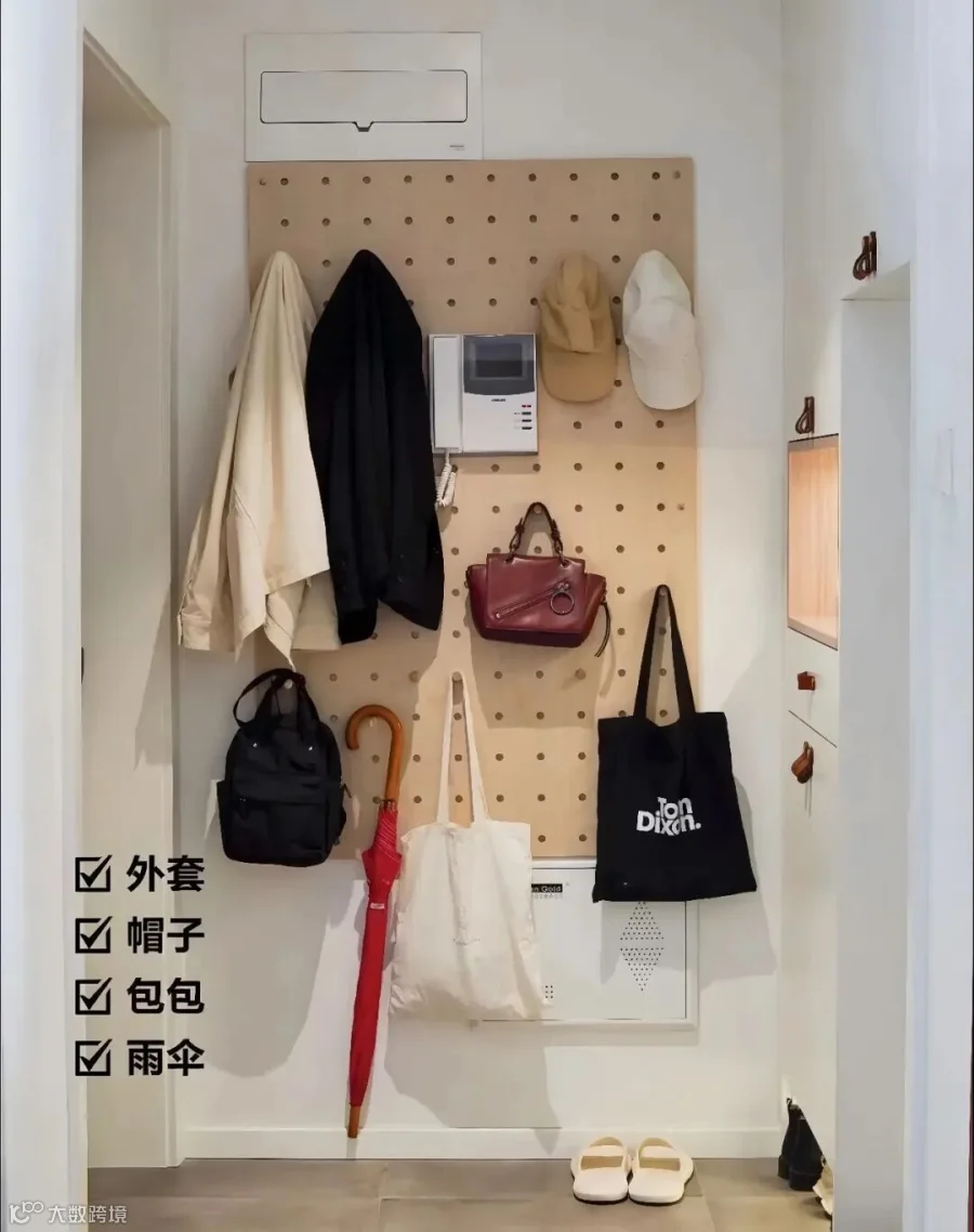 在进门侧边的墙上装一块洞洞板,钥匙挂钩一插,口罩挂上去,外套也能挂,回家进门第一时间就把随身东西都放下,太爽了,根本不会带得满屋子都是东西。还不占一点地面空间,完美解决没玄关的痛。