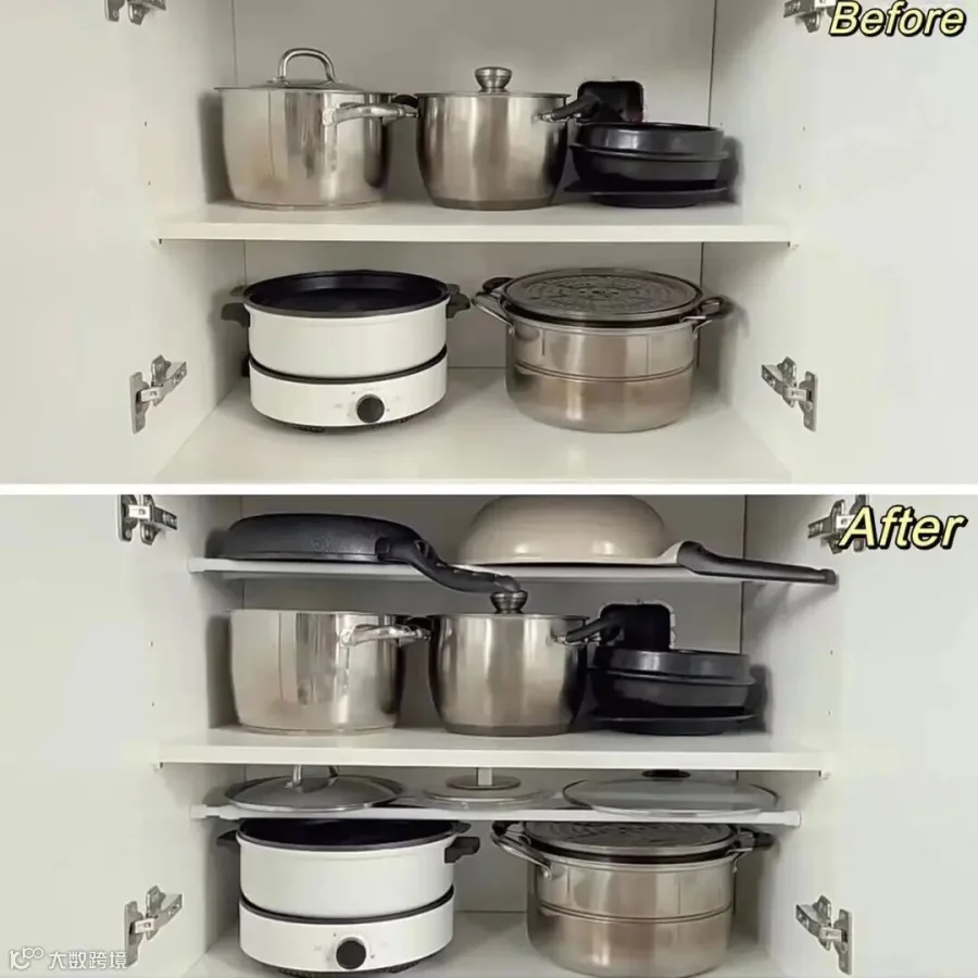 就说厨房的橱柜吧,你有没有发现,放了大锅之后,上面总会空出来一大截,扔了可惜,堆东西又掉下来,烦都烦死了。 横着放两根伸缩杆,直接就是一个简易层板啊!平底锅啊锅盖啊这些零碎,直接往上一摆,完美把空出来的空间用得干干净净。