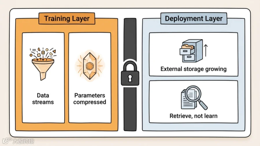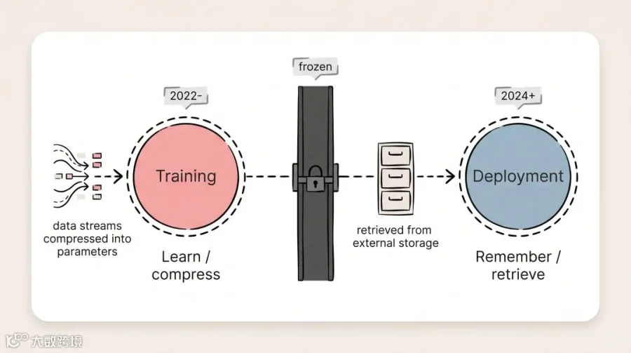 训练阶段,模型在做的事情是有损压缩的,把原始数据压缩成参数,丢掉冗余的东西,提取规律。正是这种舍弃,让它学到了可以迁移的结构,不仅仅是记住例子。但部署之后,我们不让它继续压缩了。我们给它搭了一个越来越大的外部存储,让它查而不是学。