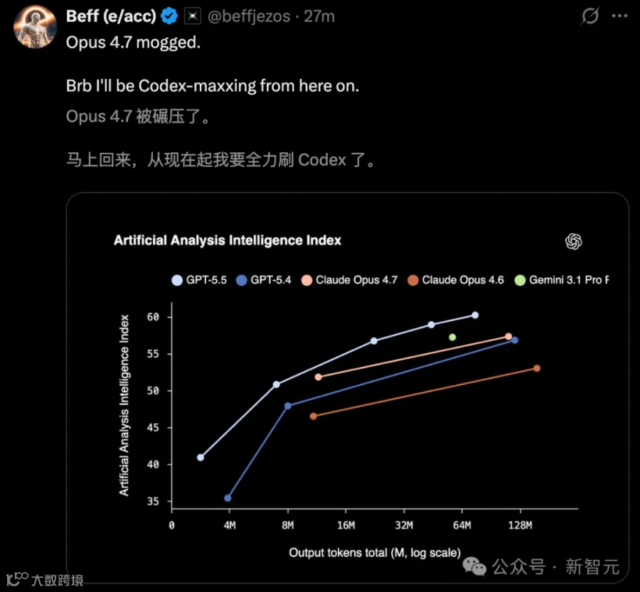 总言之,GPT-5.5的诞生,堪称迎来了脱胎换骨的蜕变。对战Opus 4.7,一张图就够了。
