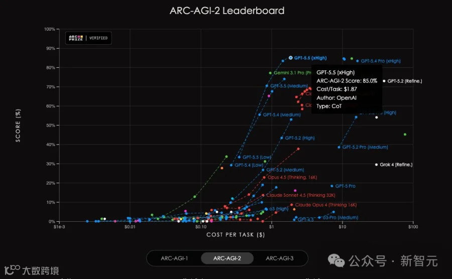 在AAI测试中,相同输出token下,GPT-5.5智能指数冠绝全球;另在ARC-AGI-2上,同样刷新了SOTA。