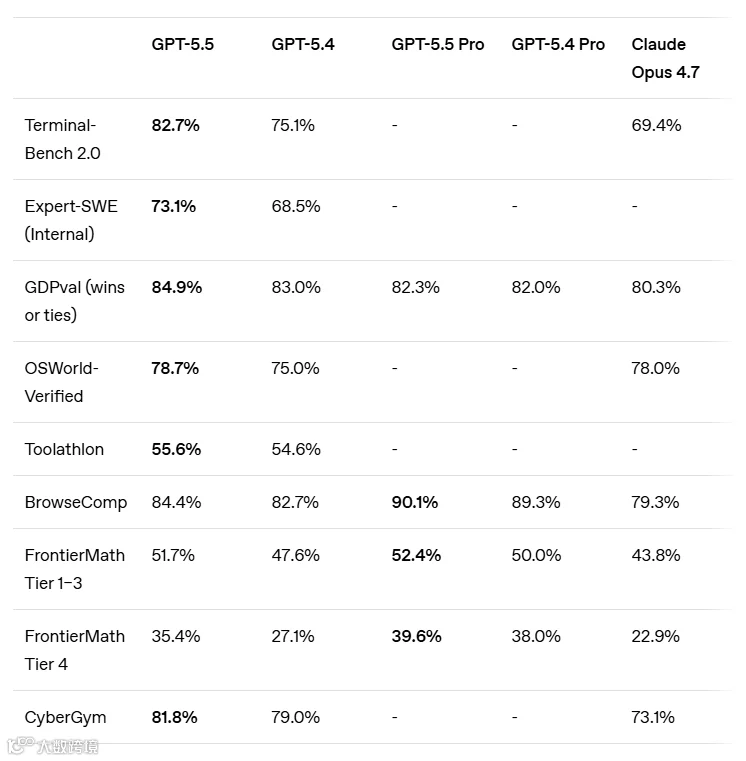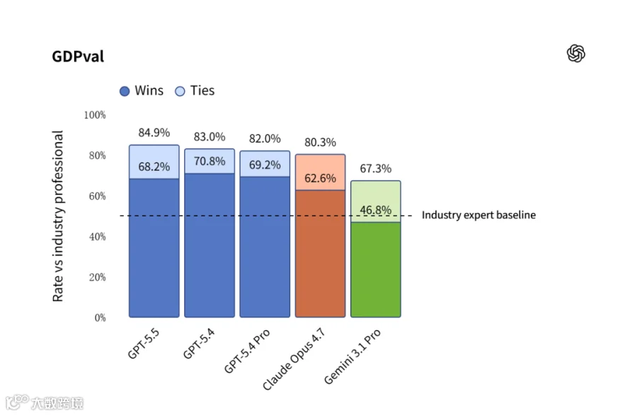 • 知识工作基准测试 GDPval: GPT-5.5 拿下 84.9%,高出 Claude Opus 4.7 整整 4.6 个百分点。 -