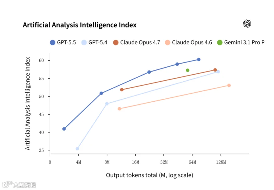 与上一代 GPT-5.4 相比,新模型在代码、知识工作、科学研究三个核心领域全面拉开身位。根据 Artificial Analysis Intelligence Index 的综合测试,GPT-5.5 的表现可以总结为两点: