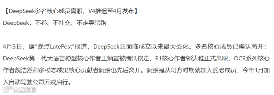最近圈子里传闻不少:一边是估值狂飙,另一边却是核心成员被大厂“挖墙脚”。有报道说 R1、OCR、多模态这些方向的大拿,不少都去了腾讯、字节、元戎启行。