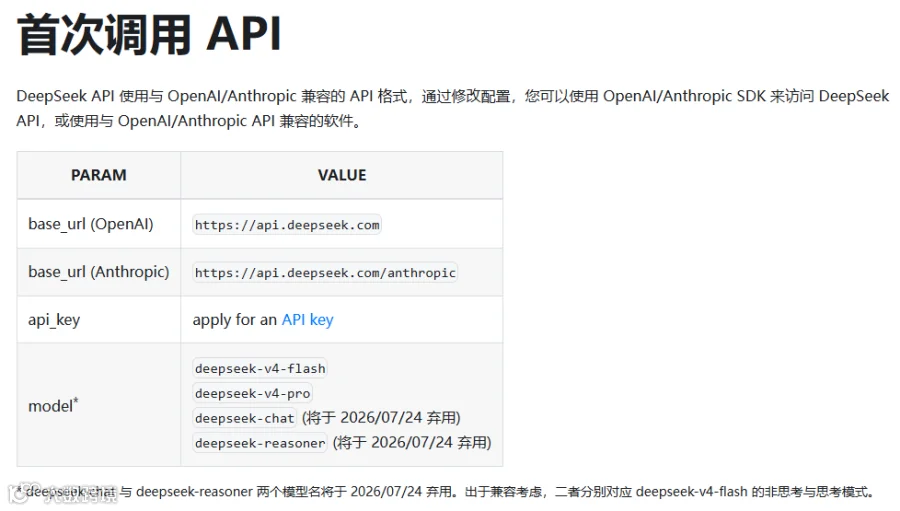官方 API 文档已经更新了,格式完全兼容。模型名记得改,追求极致效果的调deepseek-v4-pro,追求响应速度和成本的调deepseek-v4-flash。