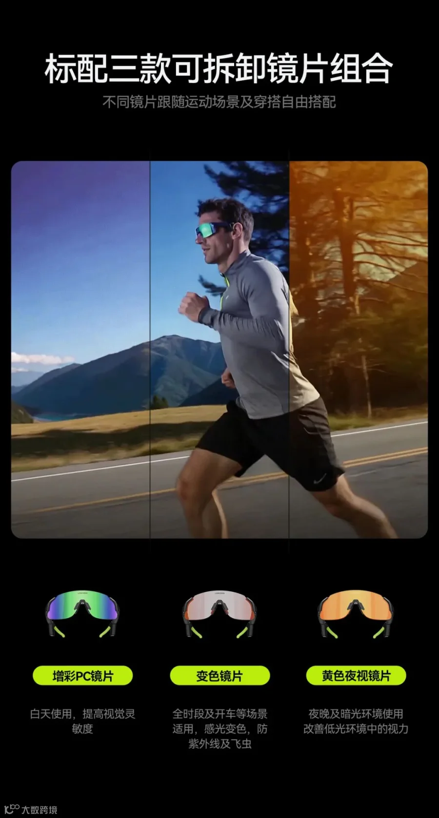 · 黄色夜视镜片:夜晚或暗光环境用,改善低光视力,夜跑、夜骑更安全。