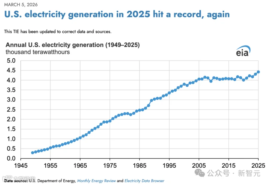 按照美国能源信息署(EIA)数据,2025年全美发电量创下历史新高,达到4.43千TWh。如果这30GW算力持续满载运行一整年,大约消耗262.8TWh。