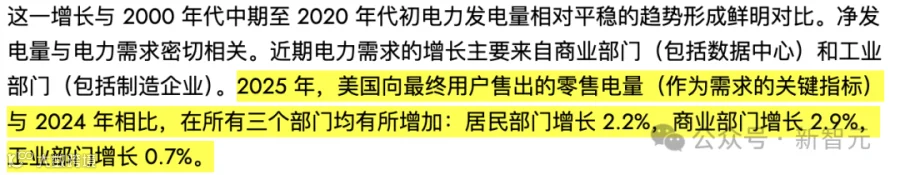 EIA最新数据显示,2025年美国零售电力销售额全面上涨,其中商业部门涨了2.9%,工业部门涨了0.7%。EIA把商业用电的暴增明确归功于数据中心。