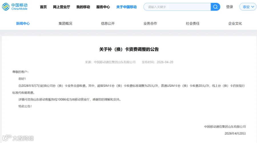 近日,山东中国移动发布补(换)卡资费调整公告,明确自2026年5月7日起,该省范围内手机SIM卡补换卡业务将全面实行收费,不再提供免费办理服务。