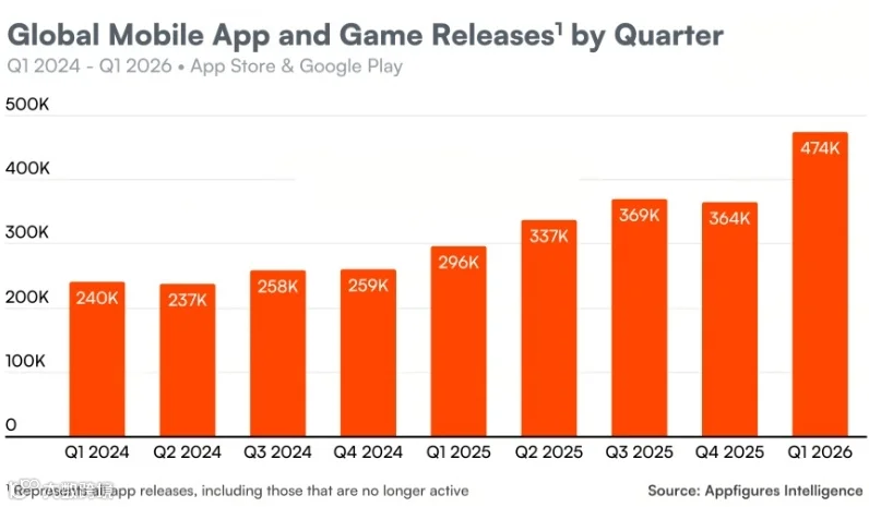 实际上根据Appfigures 数据显示,2026 年 Q1,全球 App Store 和 Google Play 新应用发布量同比增长 60%;其中 iOS 单独增长 80%。到 2026 年 4 月,两个商店的新应用发布量同比增长 104%。