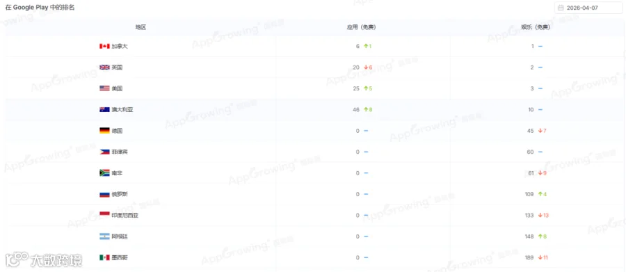 4 月 7 日买量进入峰值,当天加拿大应用排行榜升到第六,娱乐榜持续第一。