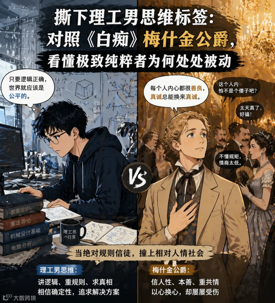 如果我们剥离文学的厚重外衣,会发现梅什金公爵与现代社会中那些被贴上“死板”、“木讷”、“不懂变通”标签的高学历理工男,底层困境100%同源重合。