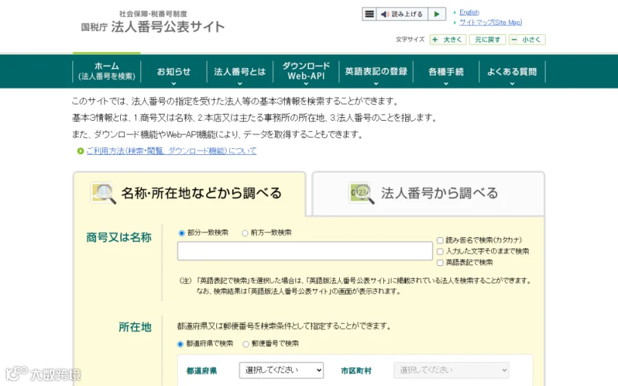日本国税厅官方企业编号查询系统。输入法人番号(13位企业编号)即可验证任何一家日本公司的合法身份。在日本做生意,第一步就是通过这个网站确认客户的公司是否真实注册。日本几乎所有正规企业都会在名片和官网上标注法人番号,相当于日本的"统一社会信用代码"。