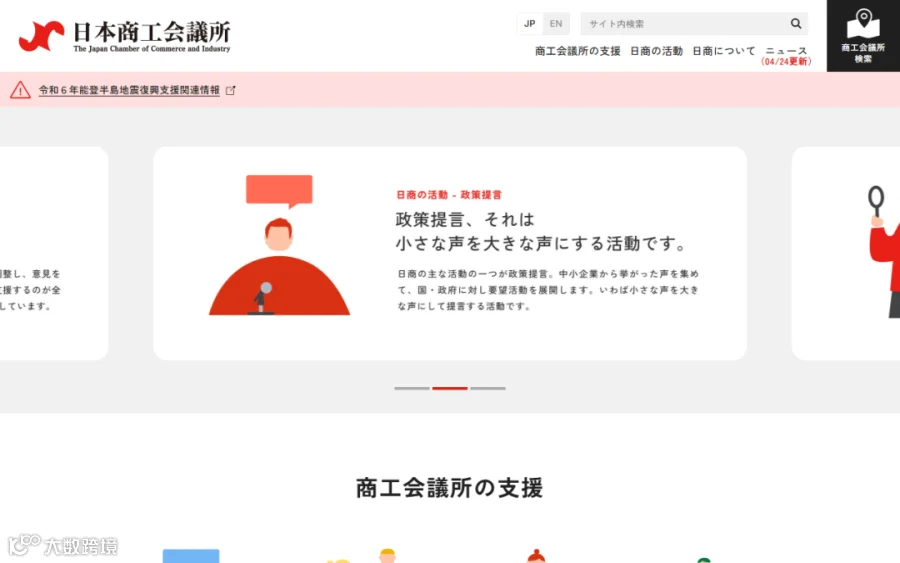 日本商工会议所总部。覆盖全日本500+地方商工会,会员企业超过100万家。通过各地商工会的会员名录和行业交流会,你可以接触到大量日本本土中小型企业——这些企业往往是日本制造业的隐形冠军,对中国零部件和原材料有持续需求。