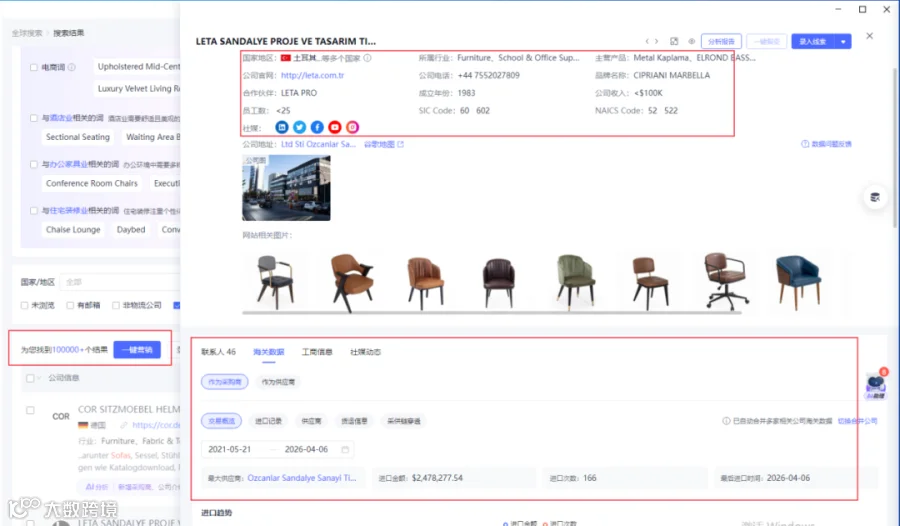 不到20秒就检索出了10000+潜在客户,随便点开一家公司的详情页,我们就可以看到——