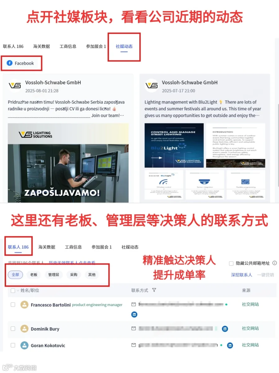 这一点是很多传统获客工具做不到的——点开联系人,能直接找到老板、管理层等决策人的联系方式!还可以看公司近期的动态。
