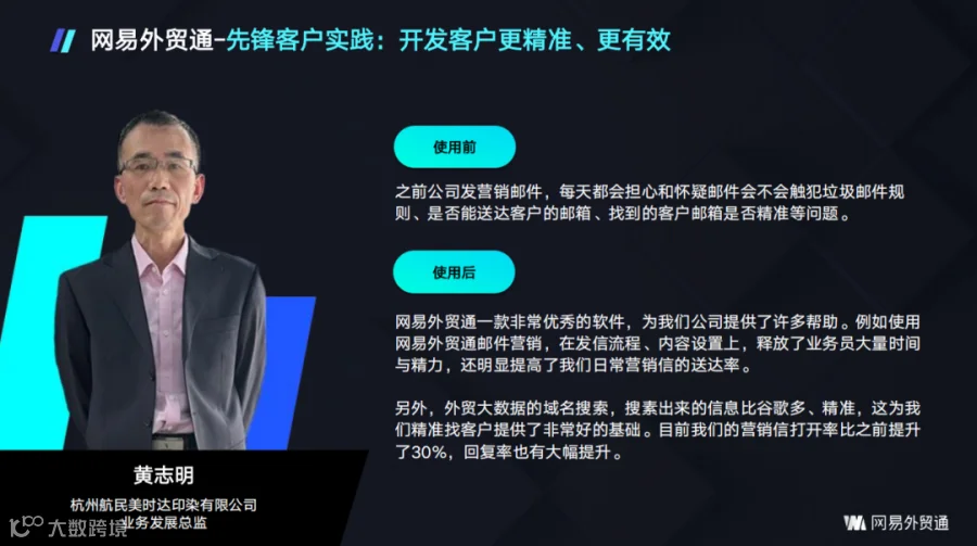 某企业通过网易外贸通整合营销,获客成本降低50%,团队人效提升60%,客户转化率提高45%。