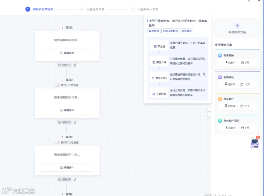 自动化营销:预设“开发信→未回复跟进→客户案例分享→优惠触达”等多轮自动跟进流程。AI根据客户打开、点击行为智能调整策略,让你不用每天盯着邮箱等回复。