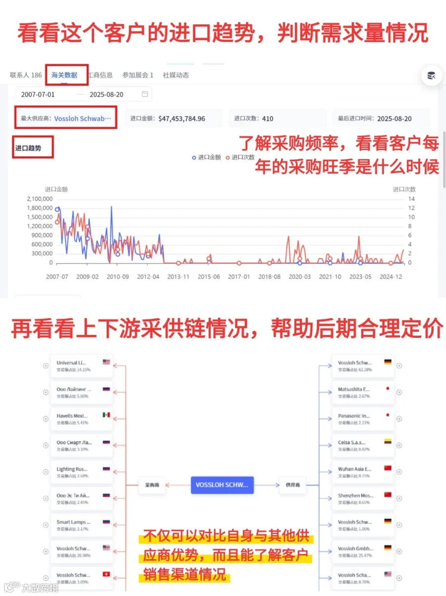最后看采供链合理定价:一看上下游采供链情况,帮你确定合理定价,避免报高被拒、报低亏本。网易外贸通的海关数据模块能让你看到客户的合作历史、采购记录、付款记录等资质信息。