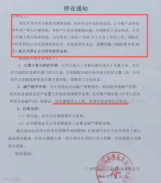 就在最近,广西华某盈峰玩具制造有限公司一纸停业通知,给数千名工人泼了一盆冷水。