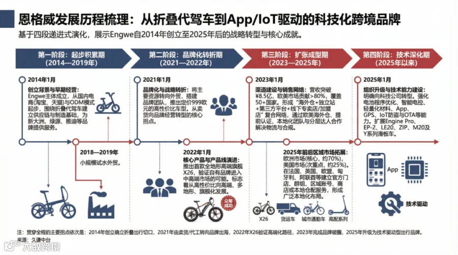 放在更长的周期里看,Engwe的四段演进其实对应四次升级。先做制造基础,再做品牌验证,随后做渠道成型,最后做技术加深。