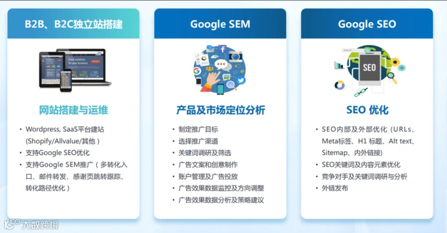 - 独立站搭建:WordPress/Shopify 等多平台建站,适配 Google SEO/SEM