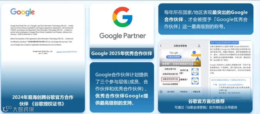谷歌官方每年仅授予区域表现最突出的代理商,易海创腾连续斩获,更运营官方出海体验中心,享受谷歌第一手产品、培训、策略支持。
