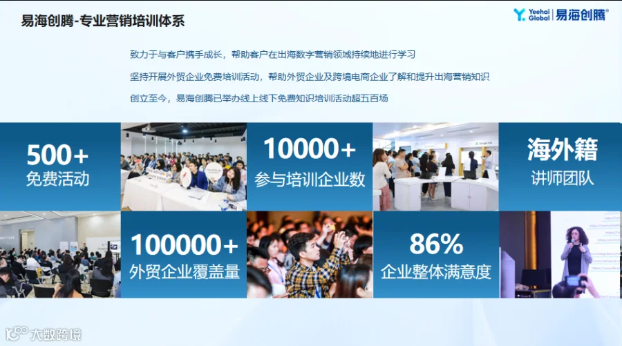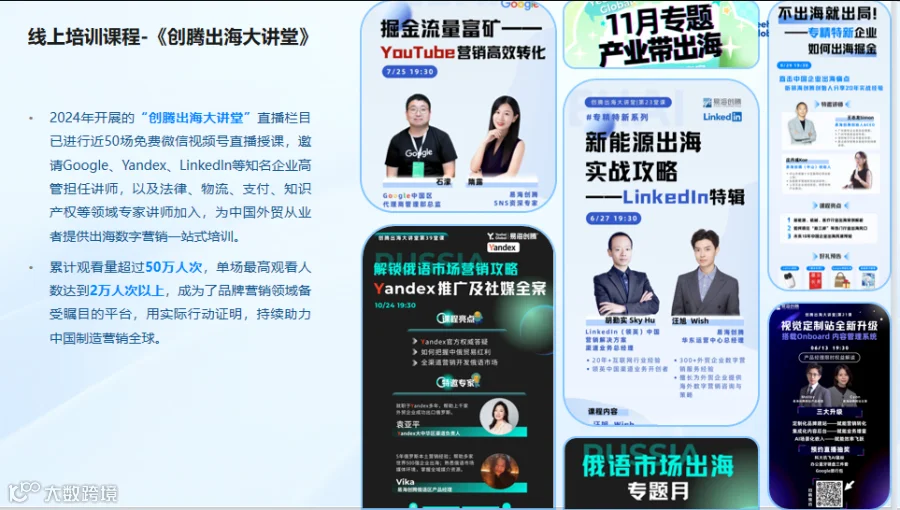 易海创腾始终坚持赋能行业: 举办 500 + 场免费出海培训 覆盖 10 万 + 外贸企业 「创腾出海大讲堂」直播近 50 场,单场观看 2 万 +,累计观看 50 万 + 邀请 Google、Yandex、LinkedIn 高管及行业专家授课,免费分享海外营销干货