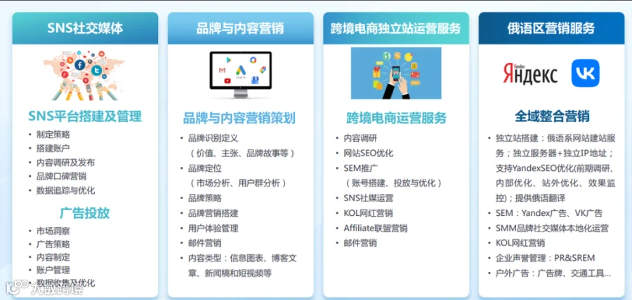 - 俄语区专属服务:网站、广告、社媒、KOL 全链路覆盖