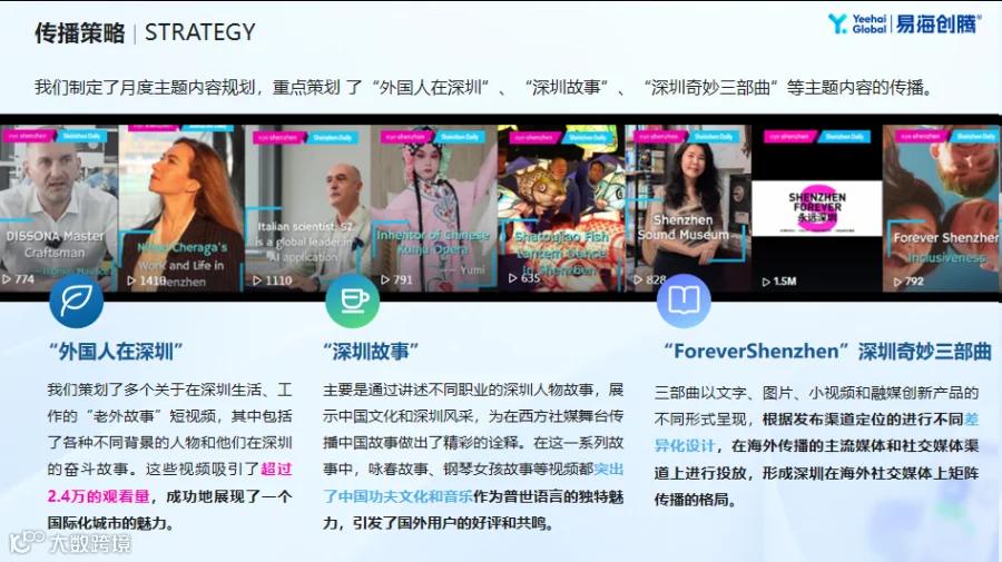 - 策略:策划“外国人在深圳”、“深圳奇妙三部曲”等主题,以“全球-地方”视角讲述深圳故事。