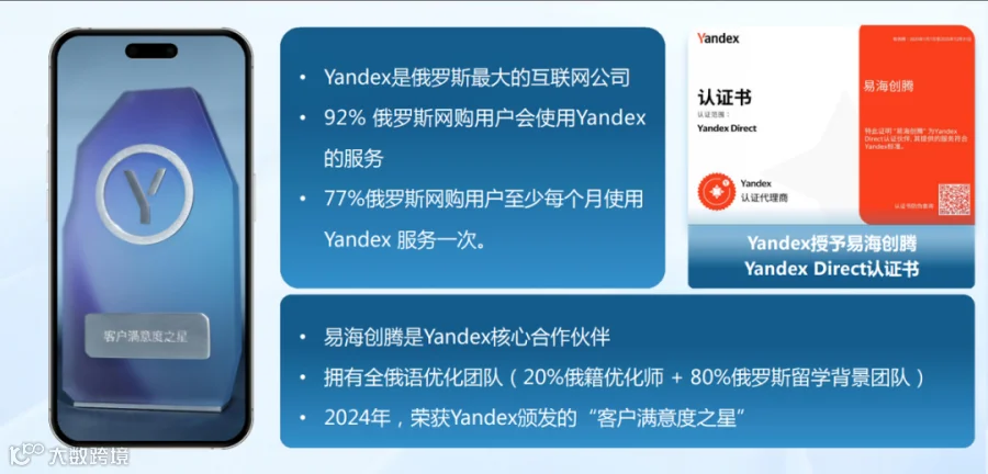俄罗斯及俄语区92% 网购用户依赖 Yandex,易海创腾拥有全俄语优化团队(20% 俄籍 + 80% 俄留学背景),是俄语市场营销的王牌玩家。
