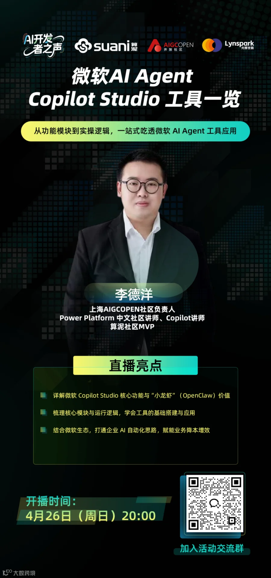 4月26日20:00,上海AIGCOPEN社区负责人、Power Platform中文社区讲师李德洋,将详解微软AI Agent工具Copilot Studio,涵盖功能价值、高级AI功能解析、核心模块操作逻辑,提供分步实践指南,助力企业开拓AI落地路径。