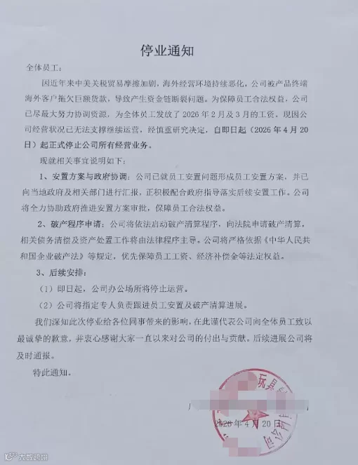 近日,广西华盛盈X玩具制造公司《停业通知》引发行业关注。该厂2021年落户广西,现正式进入破产清算程序。