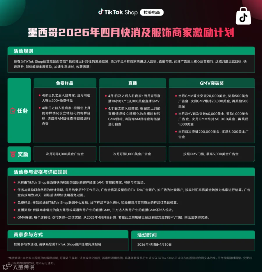 2026年4月1日-30日,平台推出服饰商家专属激励:聚焦达人样品合作与直播转化,商家最高可解锁7000美元广告金,全速撬动生意增量。