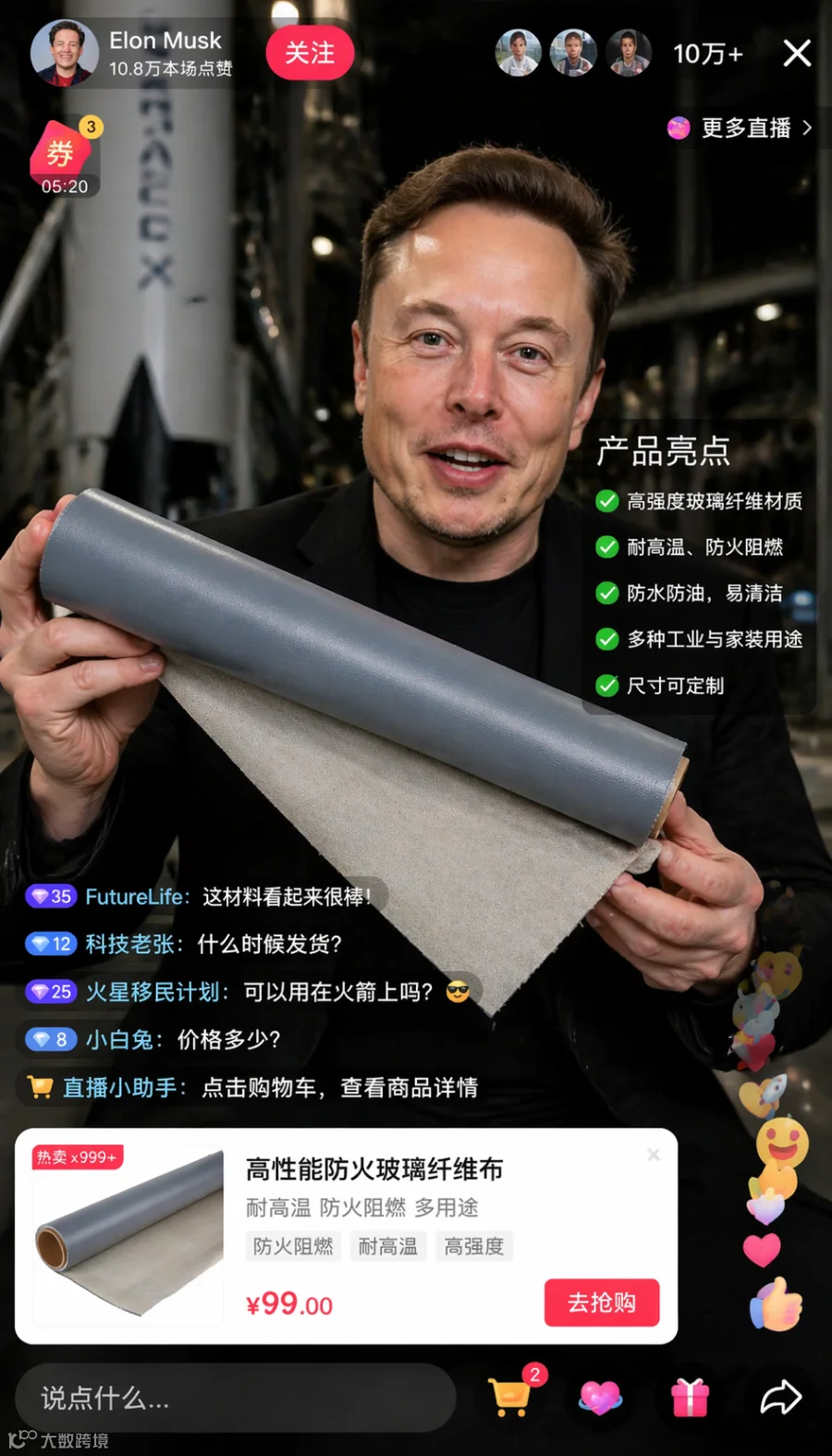 提示词:生成马斯克抖音直播间带货截图