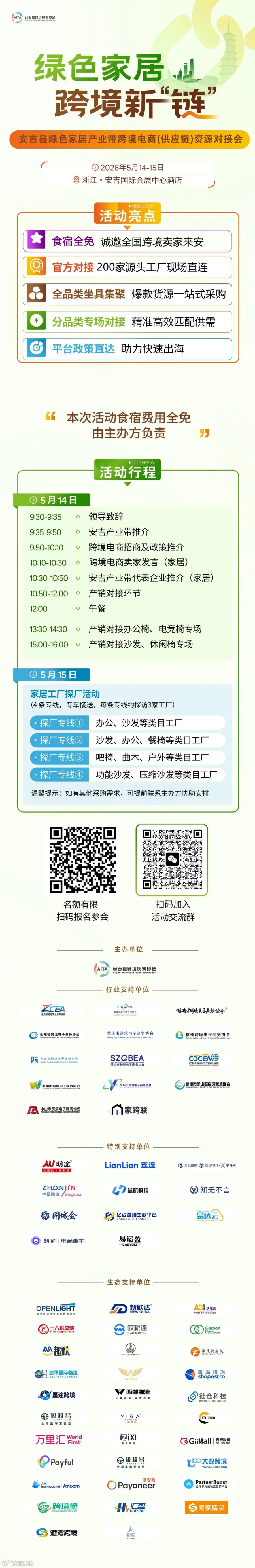 浙江安吉将于2026年5月14日至15日举办跨境电商卖家对接活动,200家优质家具供应链企业现场参展。产品涵盖压缩沙发、功能沙发、办公椅、电竞椅、餐椅、吧椅、休闲椅、按摩椅及网椅等全品类。